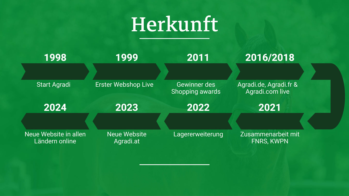 Seit mehr als 25 Jahren sind wir bereit, das Leben von Pferdebesitzern und Tierfreunden einfacher zu machen. Die Haltung von Pferden erfordert viel Zeit, Energie und Ressourcen – und dabei möchten wir helfen. Was als kleine Idee begann, hat sich zu einem Webshop für alles entwickelt, was du brauchst. Mit über 1,5 Millionen Kunden, einem Sortiment von über 75.000 Produkten und 540.000 Bewertungen bieten wir alles, um das Leben deines Pferdes einfacher und angenehmer zu machen. Egal, ob du auf der Suche nach praktischem Stallbedarf, den neuesten Trends für Reiter oder einem schönen Geschenk für deinen Vierbeiner bist, bei Agradi bist du immer richtig!
