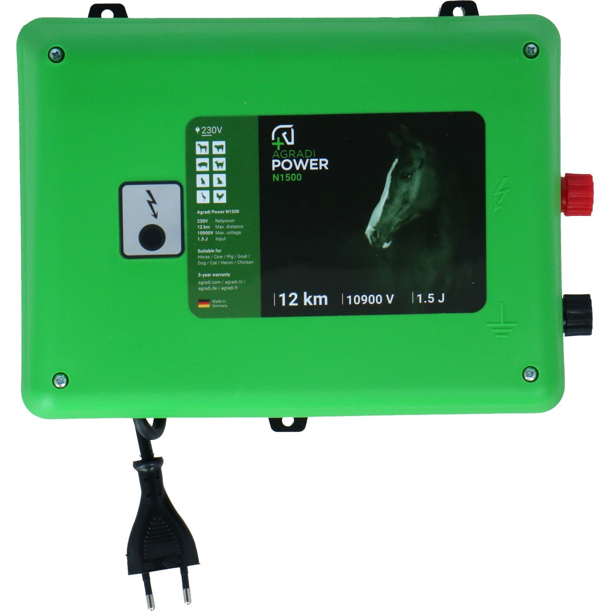 Das Agradi Power N1500 ist für Weidezäune bis zu 12 km ohne Bewuchs, 4 km mit leichtem Bewuchs und 1 km mit starkem Bewuchs geeignet. Mit einer optischen Kontrollleuchte behalten Sie immer den Überblick über die Funktionsweise Ihres Weidezaunsystems.