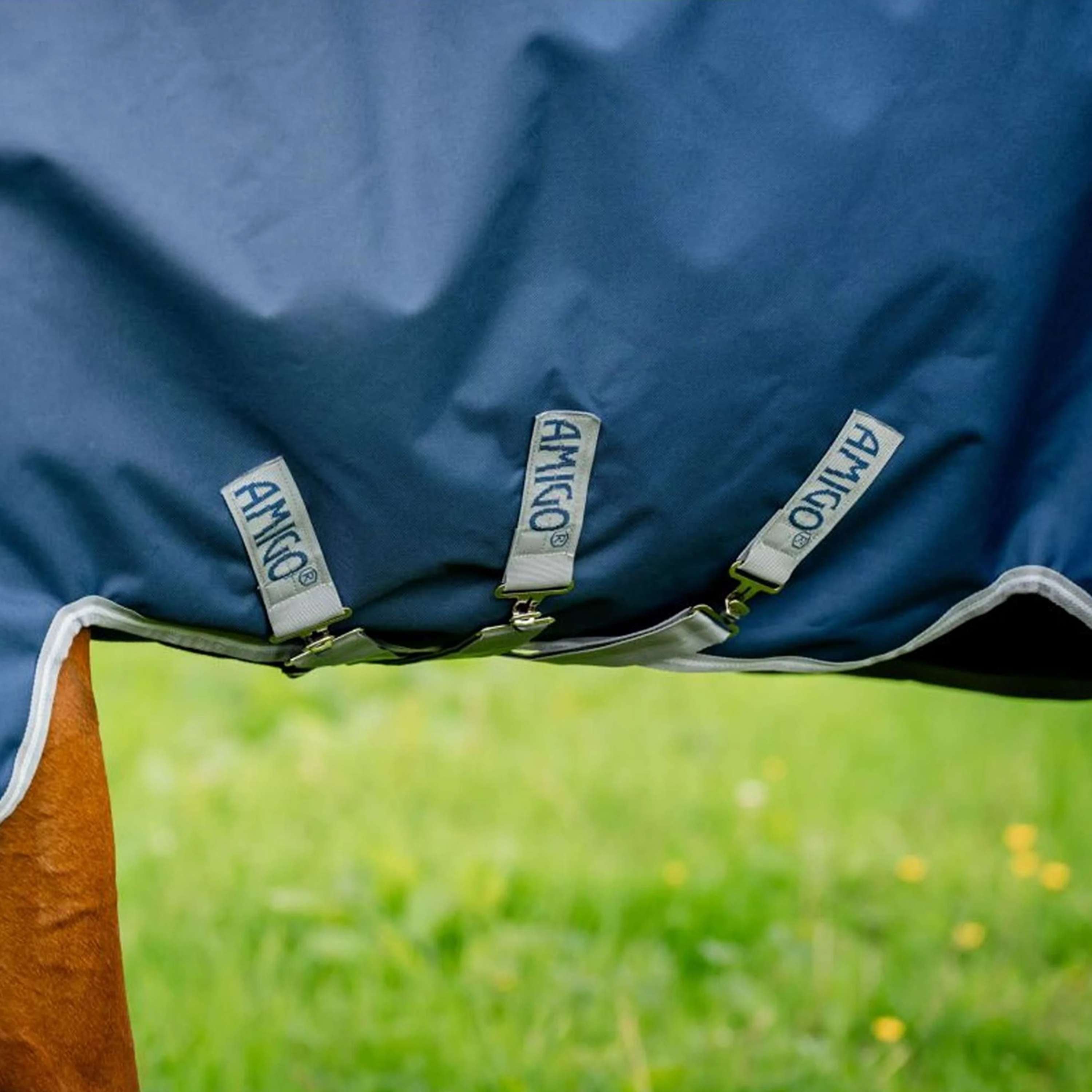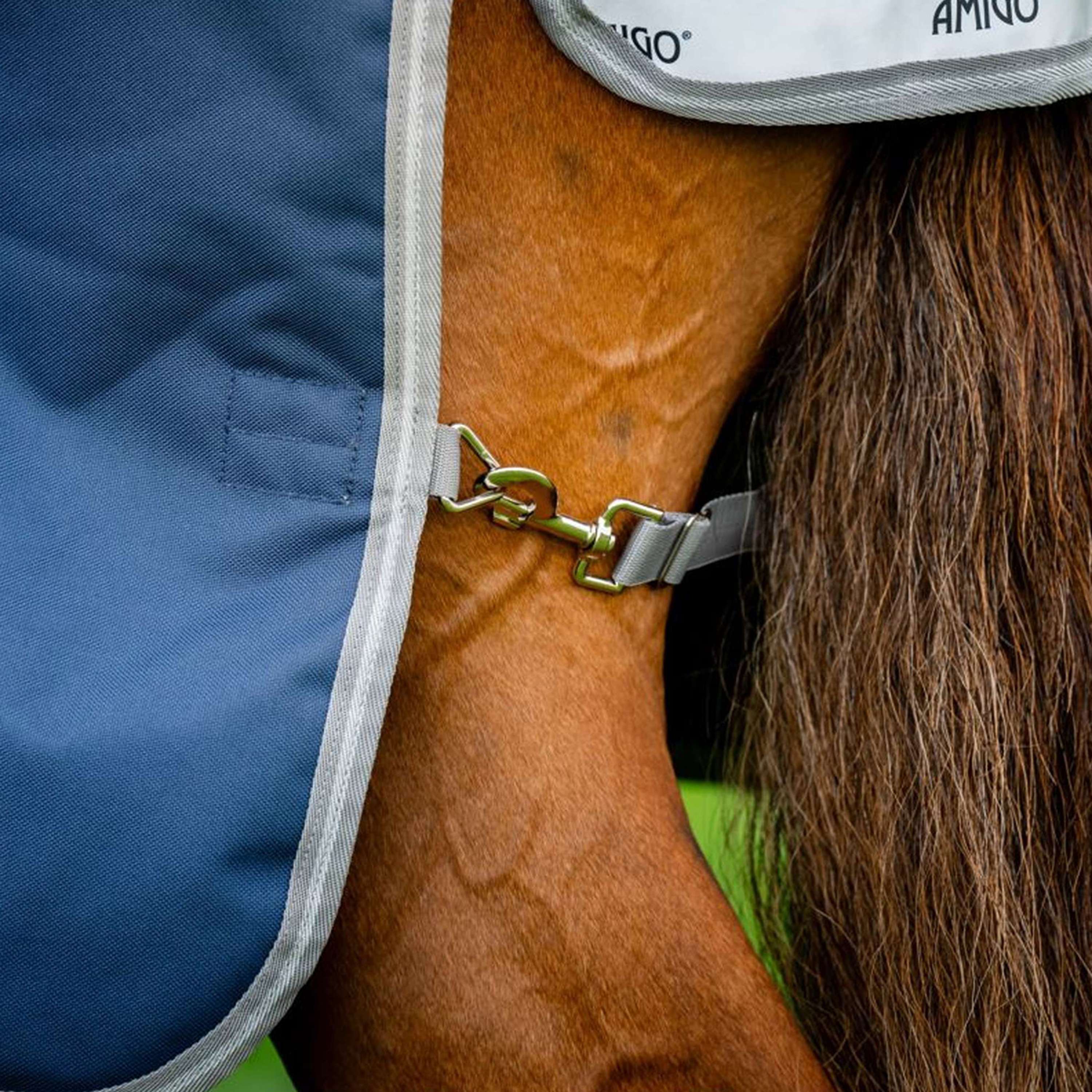 Ausgestattet mit einem V-Front-Verschluss, der den Druck auf die Schulter eliminiert und mehr Komfort beim Grasen ermöglicht. Kompatibel mit dem Horseware-Liner-System® und den abnehmbaren Amigo-Turnout-Kapuzen®, die zahlreiche Auswahlmöglichkeiten und Flexibilität bieten. Doppelte Beinbögen, um die Bewegungsfreiheit zu erhalten und gleichzeitig zu ermöglichen, dass die Decke sicher unter dem Bauch bleibt. Reflektierende Streifen für erhöhte Sichtbarkeit und 3 Gurte.