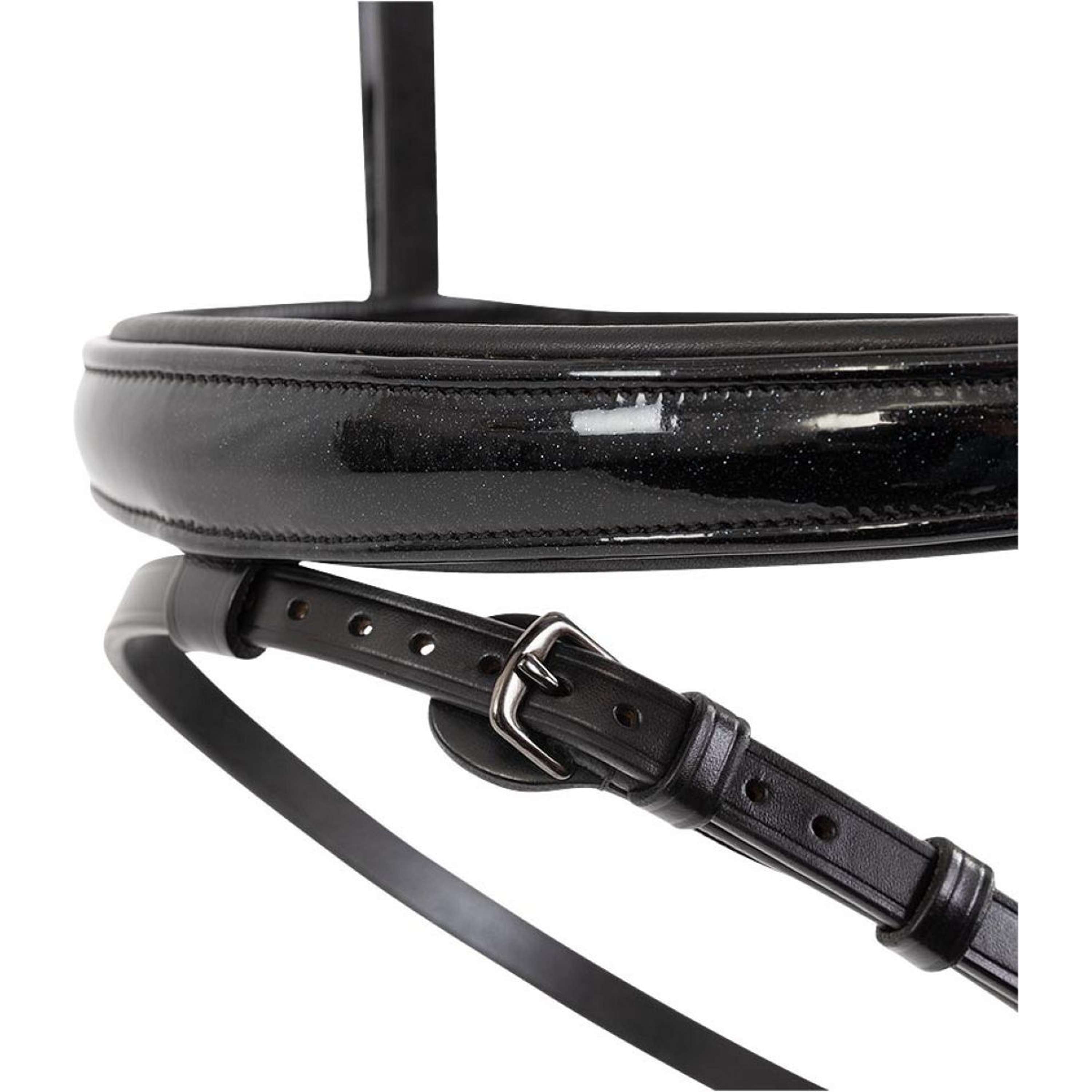 Gefertigt aus hochwertigem Leder und verziert mit einem glänzenden metallic Effekt, der für besondere Akzente sorgt. Die robusten und widerstandsfähigen Eigenschaften des Leders garantieren eine lange Lebensdauer des Zaums.