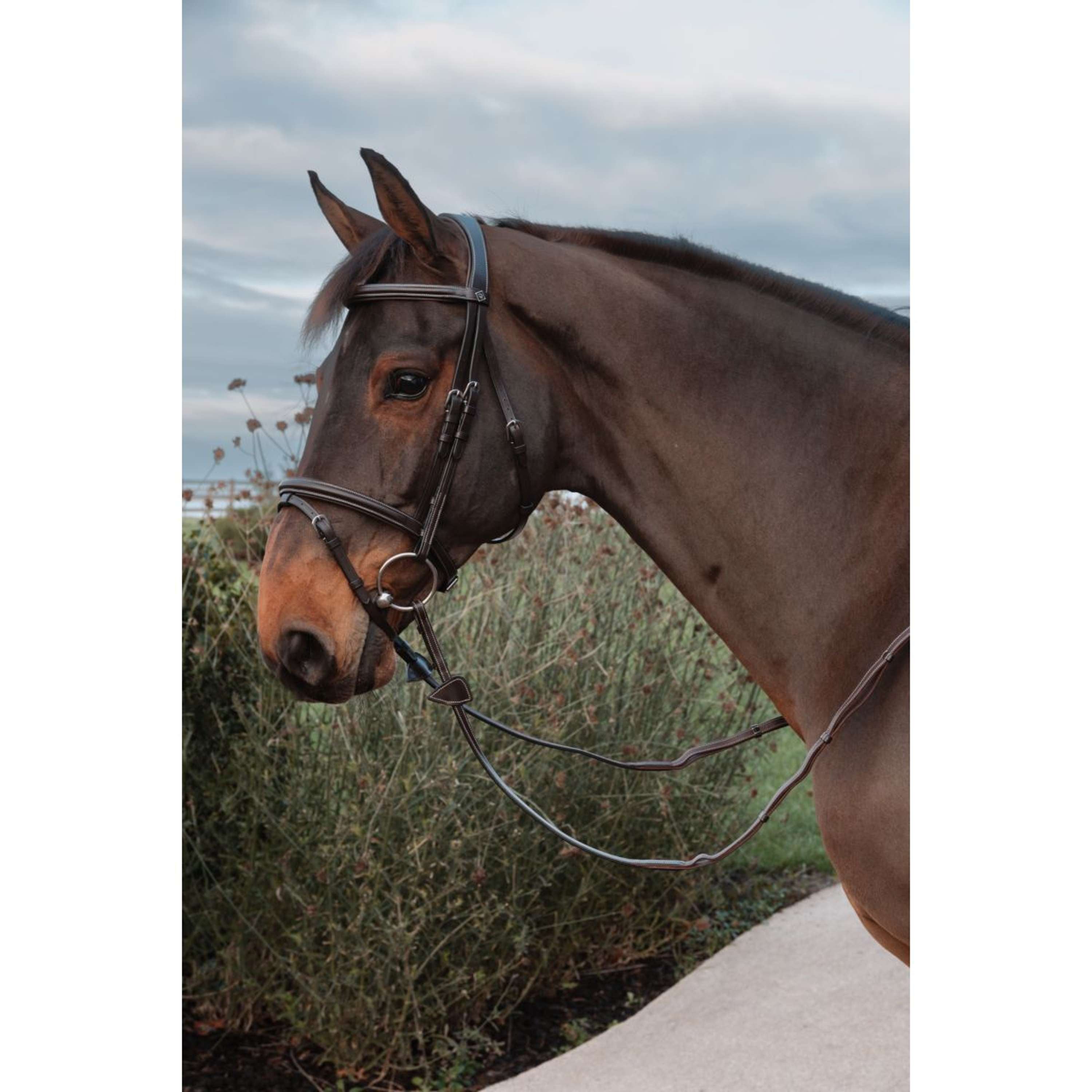 Die Zügel sind Teil der Working-Kollektion, was bedeutet, dass die Farbe der Nähte cremefarben ist. Die Schnallen sind aus Edelstahl. Erhältlich in Braun und Schwarz.