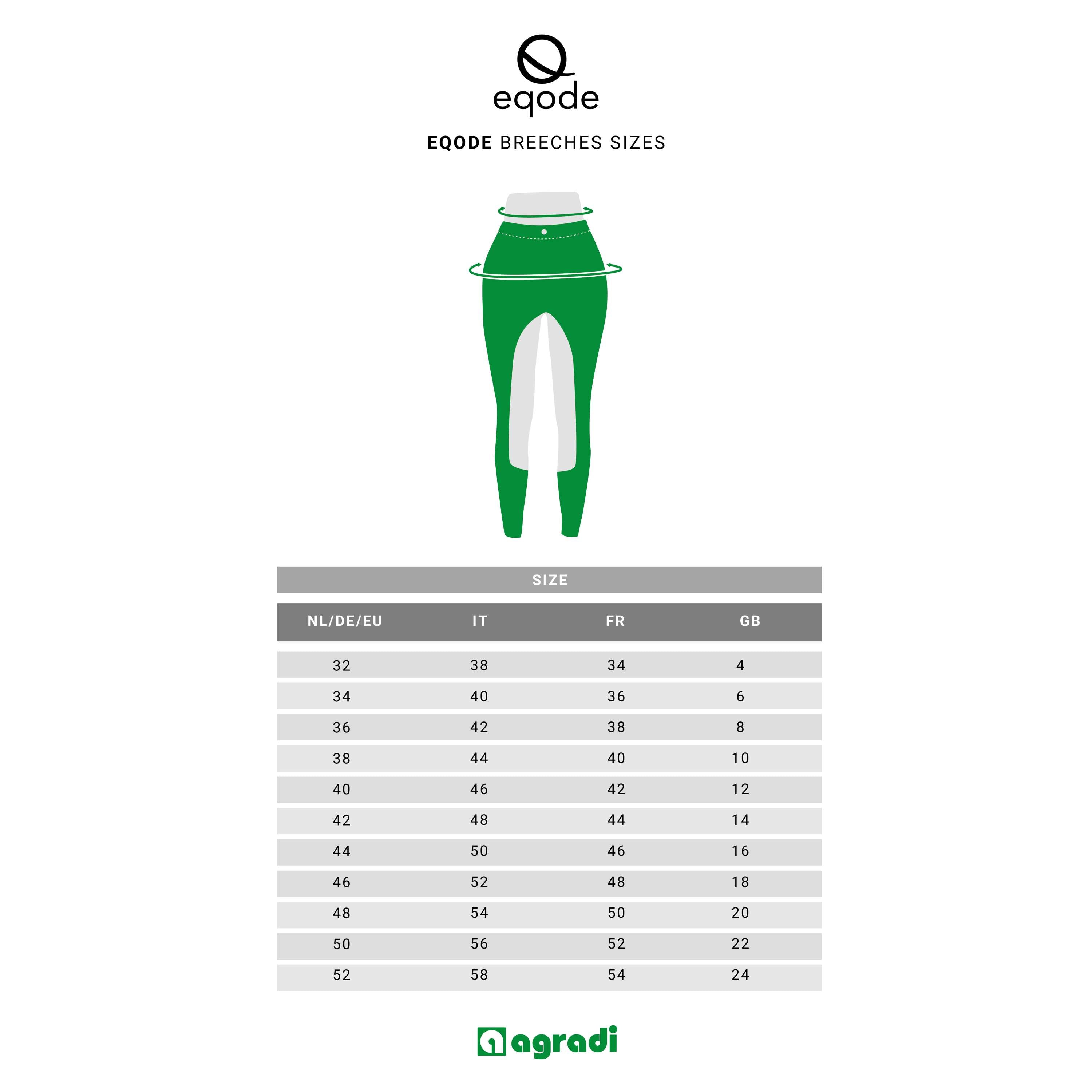Bitte beachte, dass unser Größenliner und unsere Größentabelle für Standard-EU-Größen führend sind, die Reithosen können andere Größen enthalten.