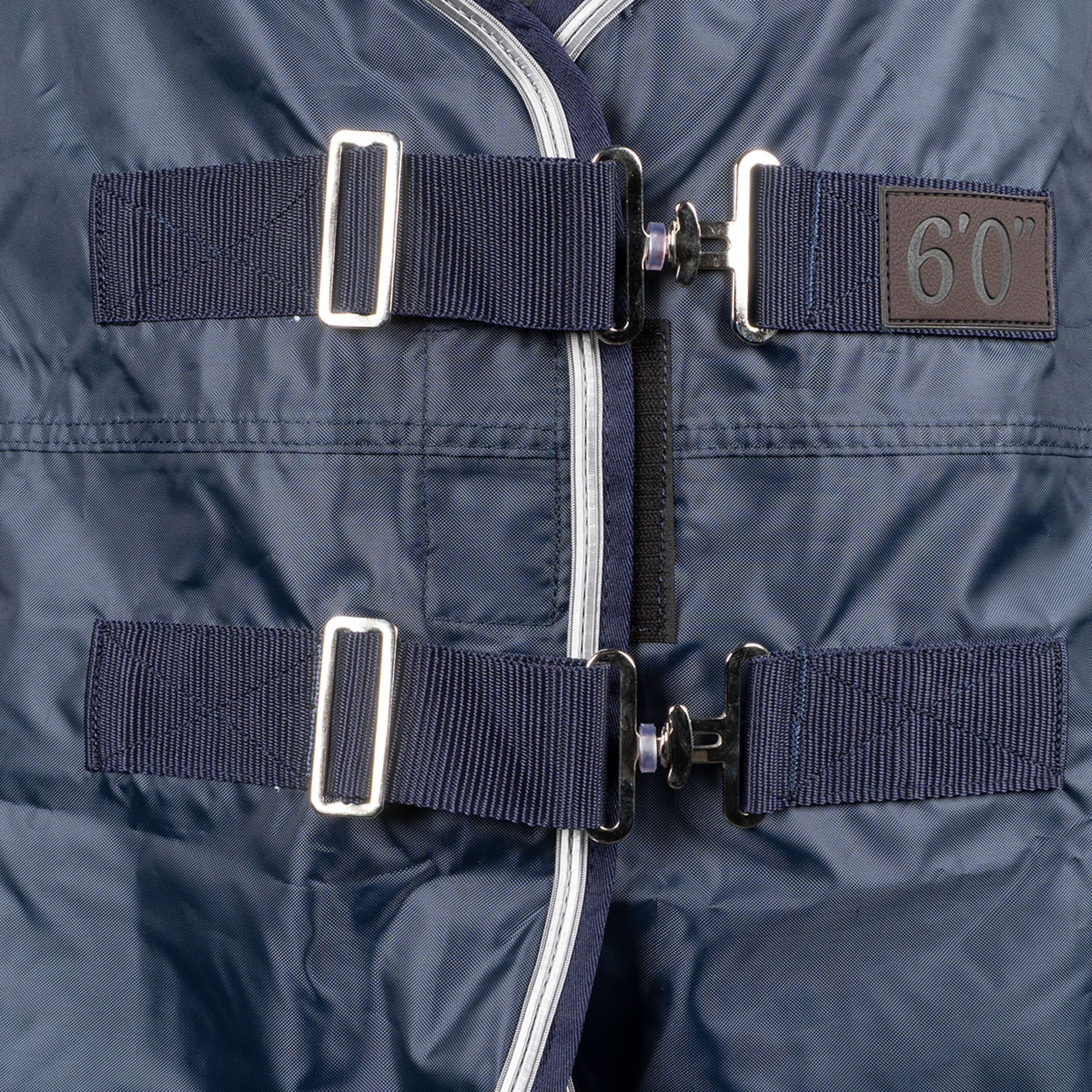 Die verstellbaren Verschlüsse und die gekreuzten Gurte mit Gummizug sorgen dafür, dass die Decke sicher sitzt. Der Widerristschutz aus synthetischem Schaffell bietet zusätzlichen Komfort, während die elastischen Oberschenkelgurte und der Schweiflatz die Decke an Ort und Stelle halten.