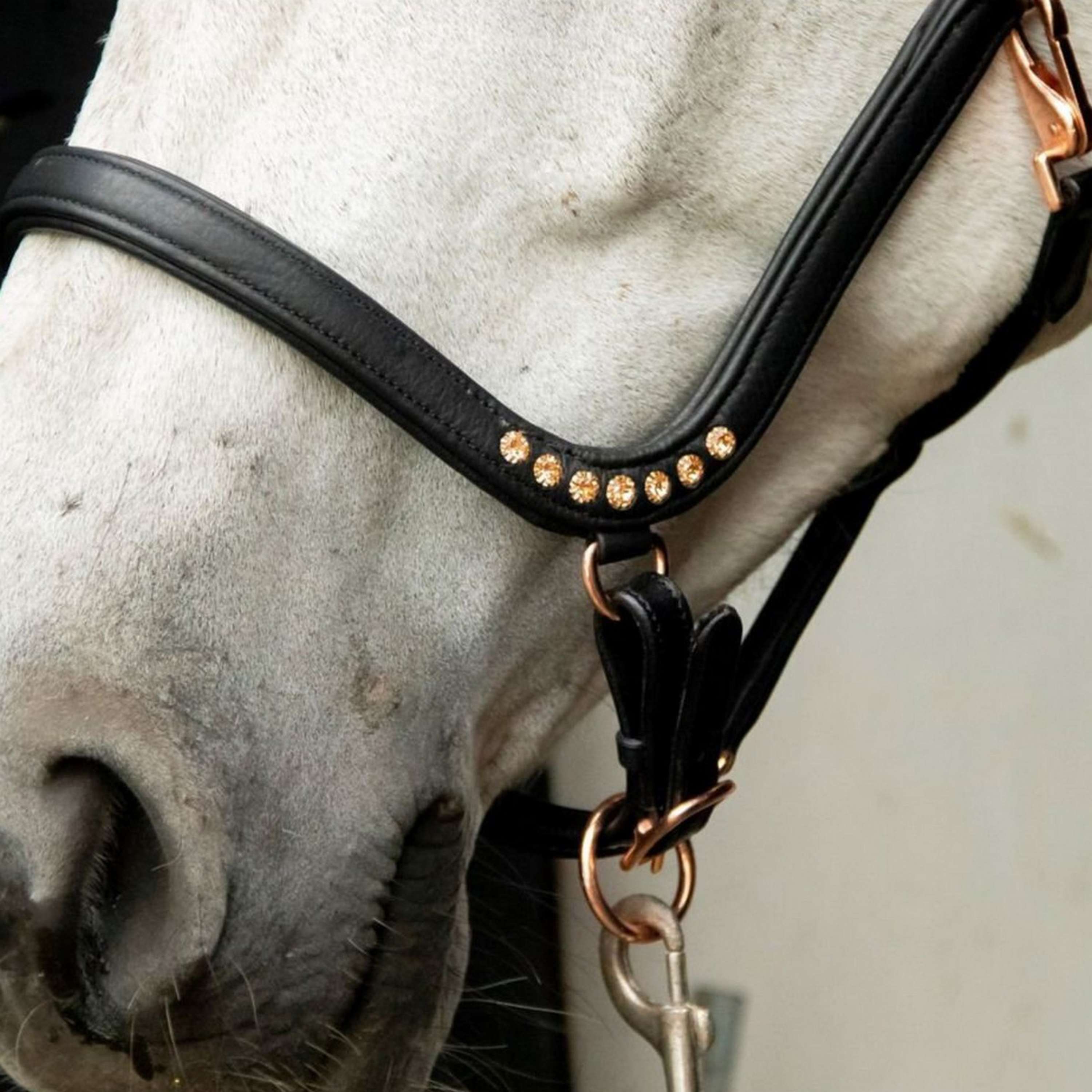 Das HB Showtime Halfter Anatomic ist der perfekte Begleiter für deinen vierbeinigen Freund. Dir gefallen roségoldene Details? Dann wirst du dieses Halfter lieben! Es ist an beiden Seiten des Nasenriemens mit roségoldenen Steinen verziert und hat dazu passende roségoldene Beschläge. Ein echter Hingucker!