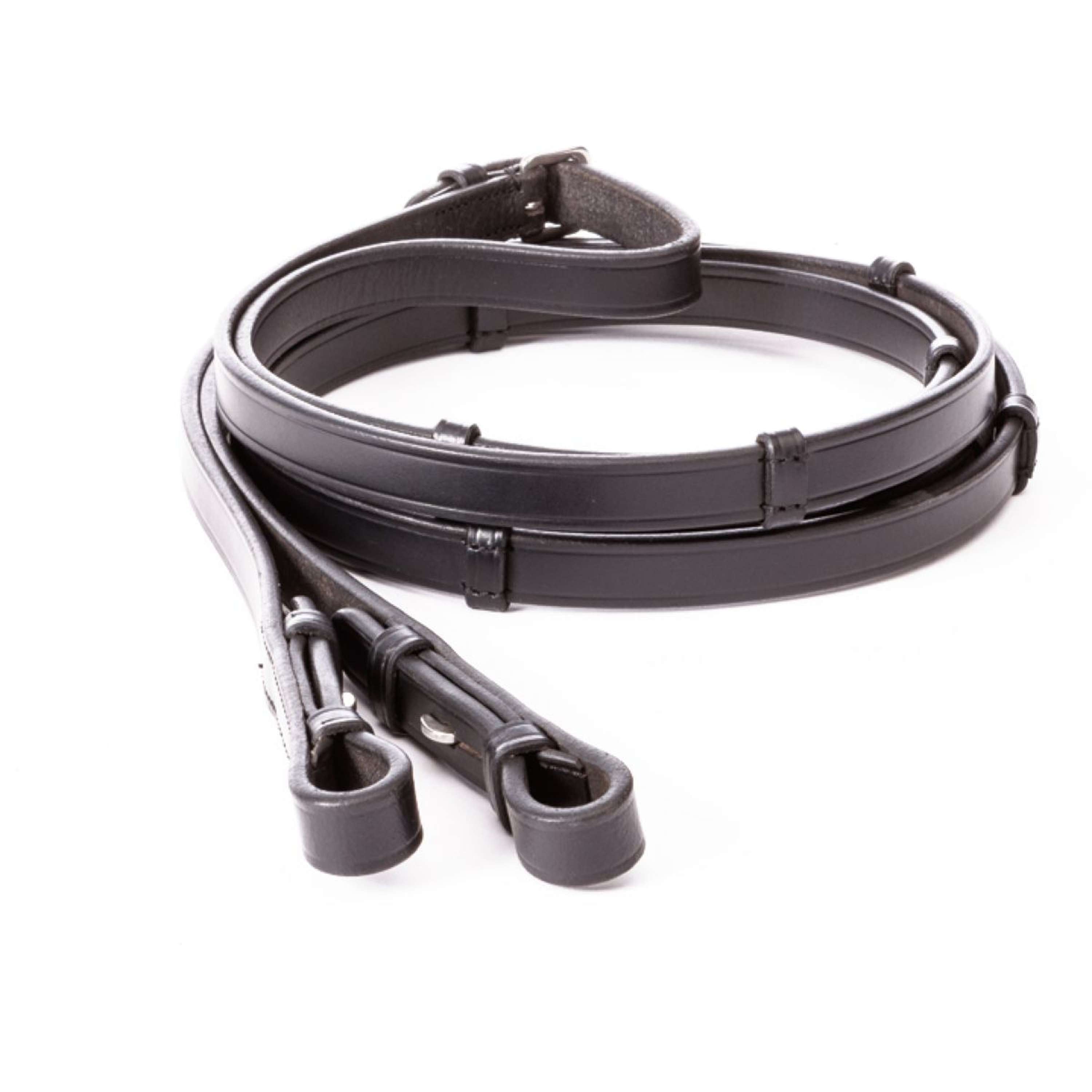 Der Zaum wird mit Lederzügeln geliefert – 16 mm Lederzügel mit Anschlagrippen und 14 mm Weymouth-Lederzügel. Das macht ihn bereit für den nächsten Ausritt.