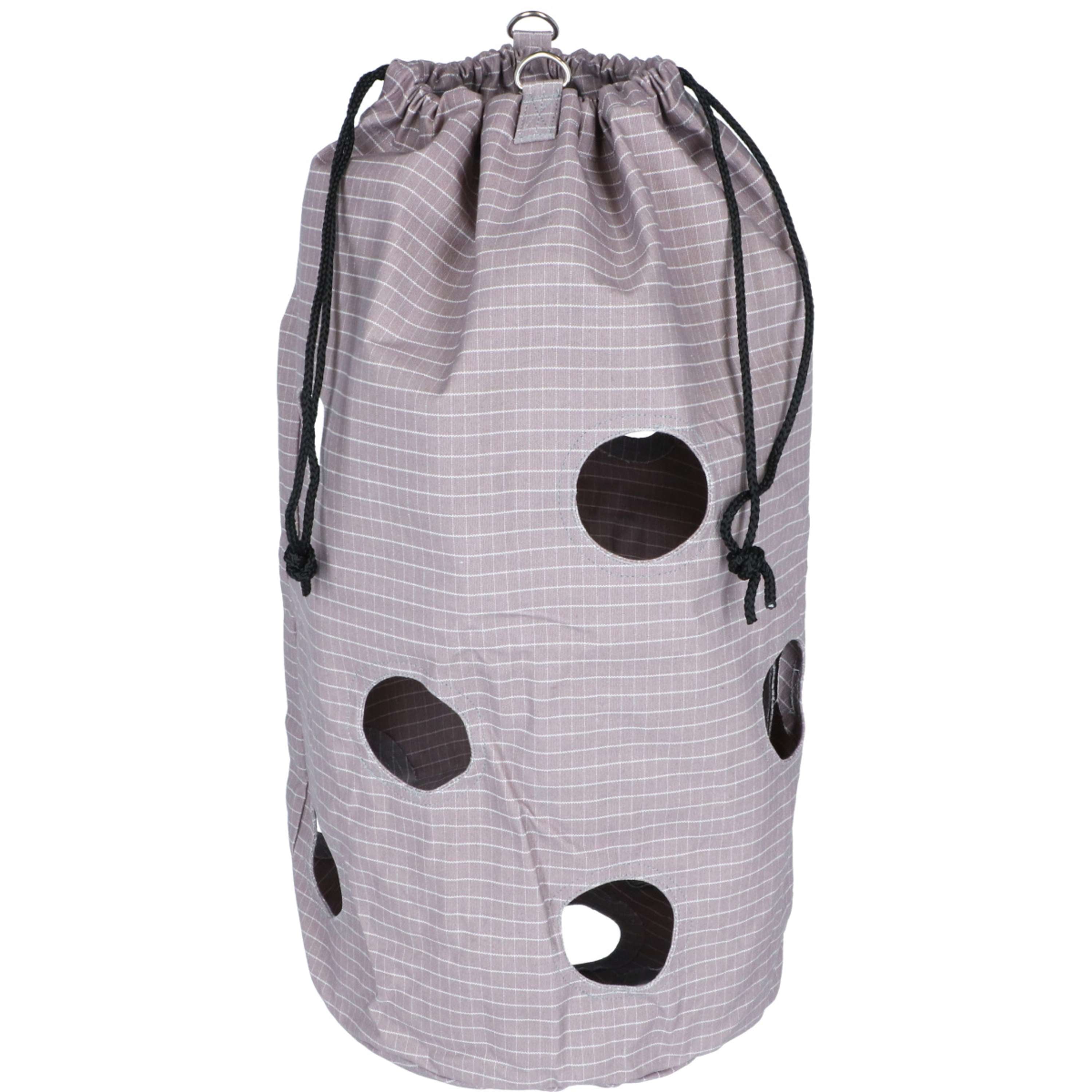 Kerbl Heusack Klein 44527676: 85 Liter, hat 12 Löcher, ist 70 cm hoch und hat einen Durchmesser von 37 cm.