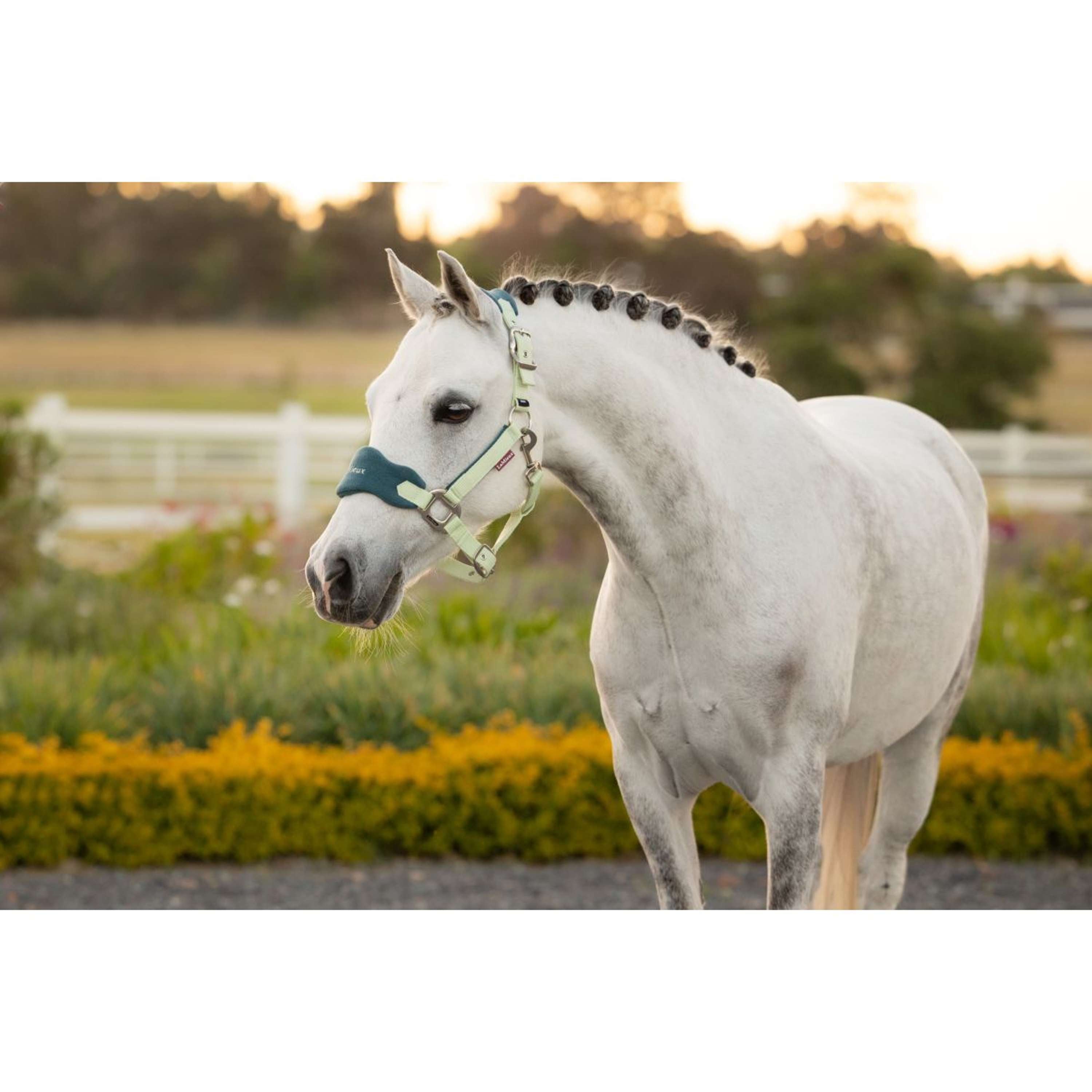 Verwöhnen Sie Ihr Pferd oder Pony mit dem unverwechselbaren LeMieux-Stil dieses weichen Halfters mit Fleece-Einsätzen an Genickstück und Nasenriemen. Die superweichen Fleece-Einsätze verteilen den Druck gleichmäßig und bieten dank zusätzlicher Polsterung höchsten Komfort für Ihr Pferd. Die Backenstücke sind mit Fleece gefüttert, um Reibung und Scheuern zu vermeiden. Das Halfter ist nicht nur stilvoll, sondern auch praktisch: Es ist an Backenstück und Nasenriemen beidseitig verstellbar und verfügt über einen Karabinerhaken für einfache Handhabung. Jedes Vogue-Halfter wird mit einem farblich passenden, 1,80 m langen Führstrick geliefert. Strapazierfähiges Nylon-Halfter mit Fleece an Nasenriemen, Backenstücken und Genickstück. Verstellbares Genickstück und Führstrick mit Karabiner. Doppelschnalle am Genickstück für beidseitige Verstellung und Befestigung. Inklusive passendem Führstrick (1,80 m).