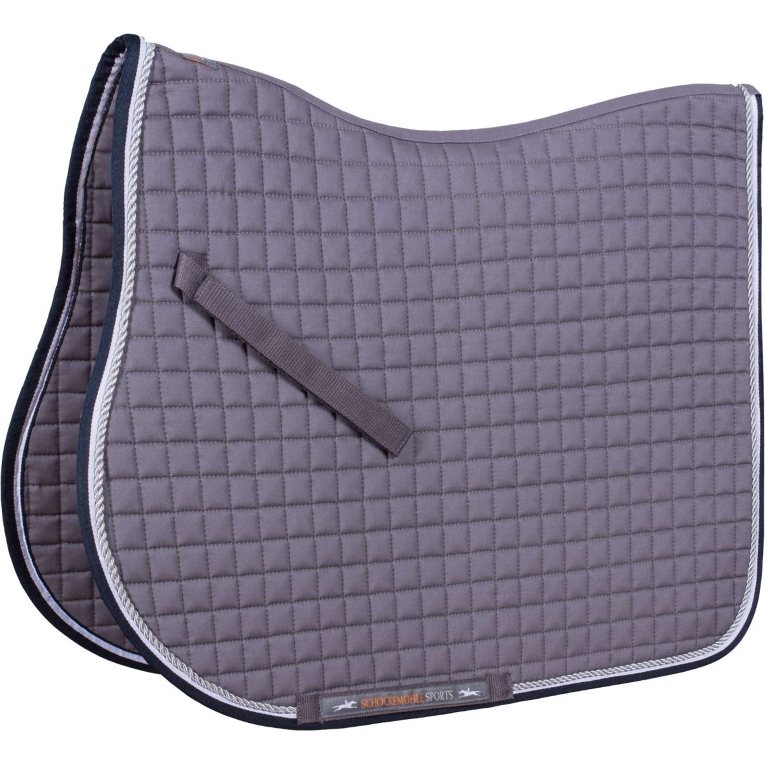 Das Pad überzeugt durch eine schicke Kordel und zweifarbige Einfassung. Das Schockemöhle Sports Logo ist auf dem Gurtband und an der linken Seite der Schabracke zu finden, was ihr ein elegantes Aussehen verleiht.