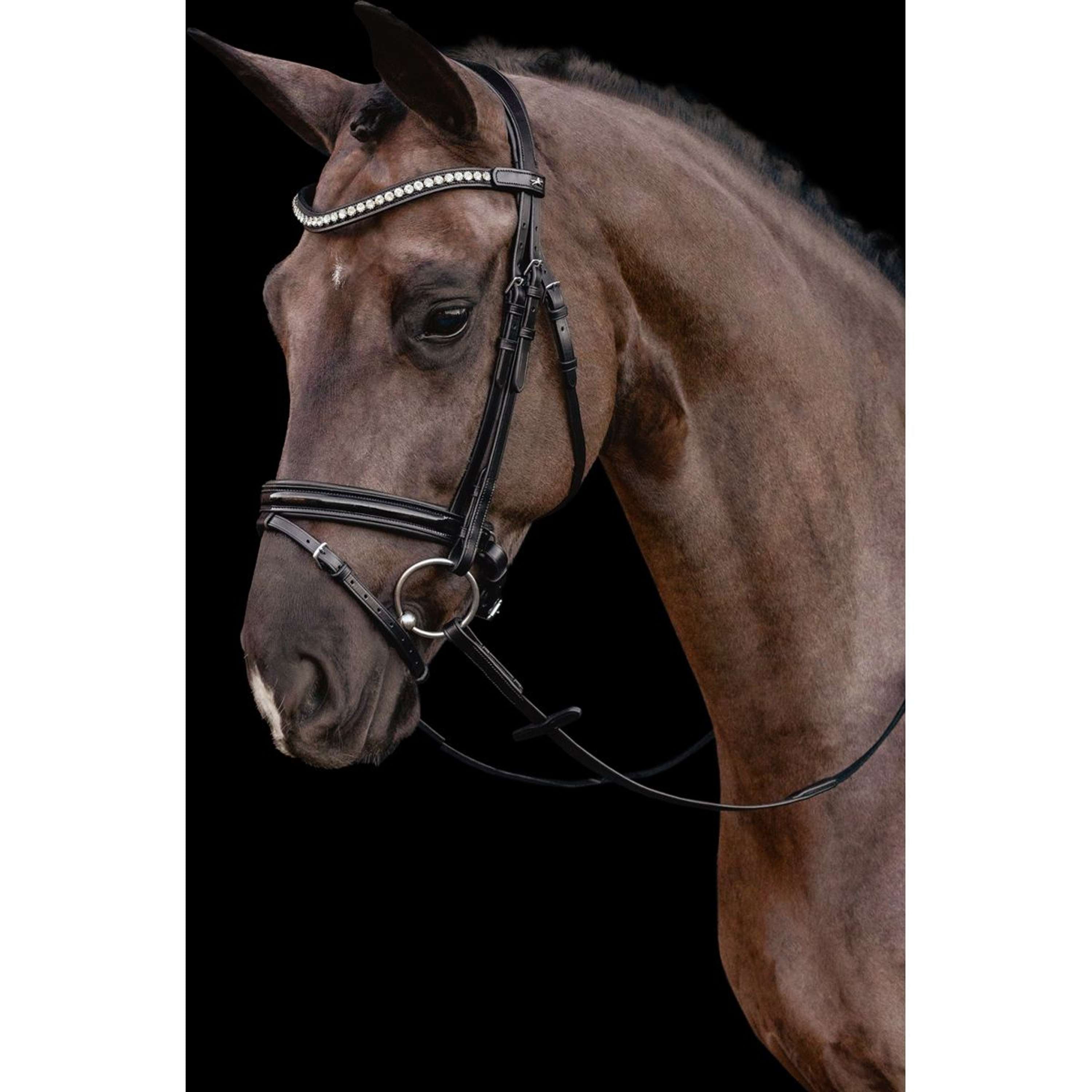 Diese Trense sieht nicht nur schick aus, sondern besticht auch durch funktionelle Details wie einen weichen, anatomisch geformten Nasenriemen und einen Stirnriemen mit dezenten Steinen. Diese Merkmale verleihen Ihrem Pferd eine elegante Ausstrahlung.